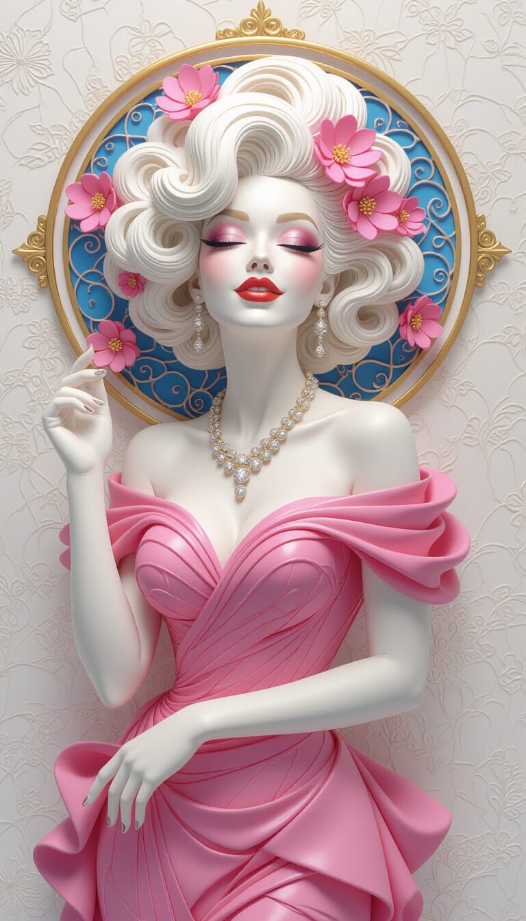 This image shows a frustrated yet elegant woman in a gala pink gown. The digital art features resin wire cherry blossom art and Escher-style architectural elements.