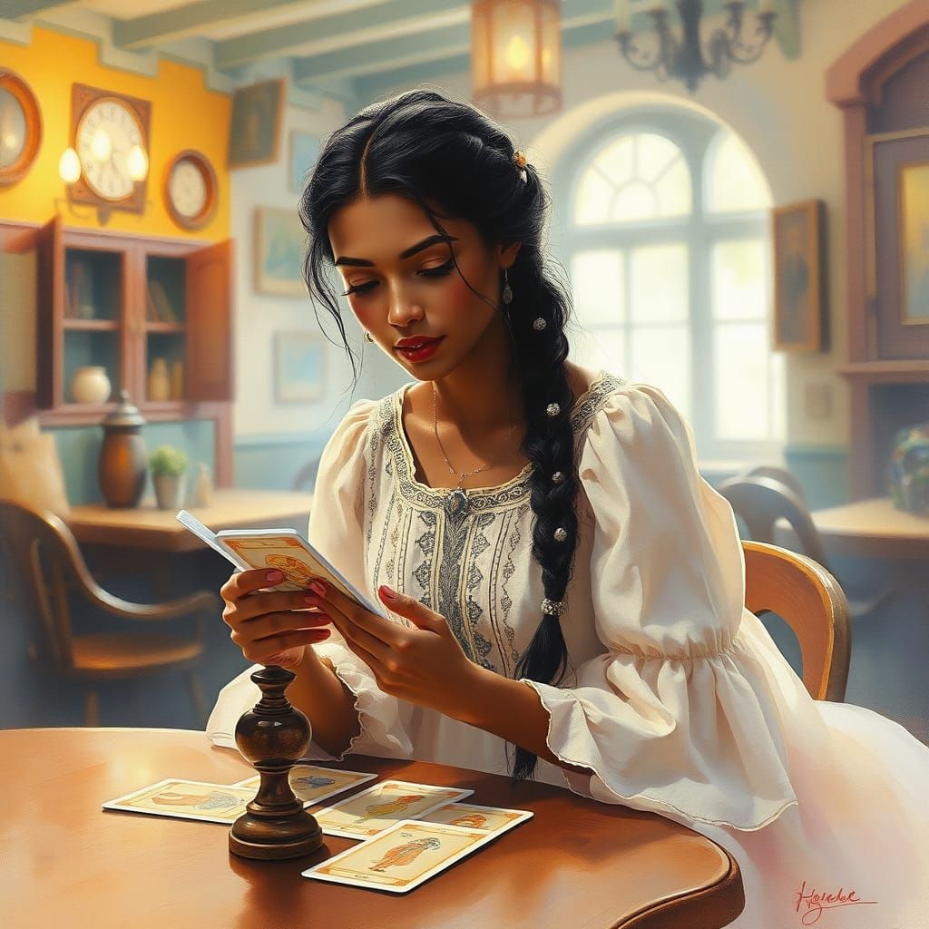 This enchanting oil painting features a young woman with ebony hair in soft braids, seated at a table reading tarot cards amidst a blurred tavern interior. The piece is characterized by impressionistic brushstrokes, pastel colors, and an ethereal lighting, creating a whimsical and magical atmosphere remi...
