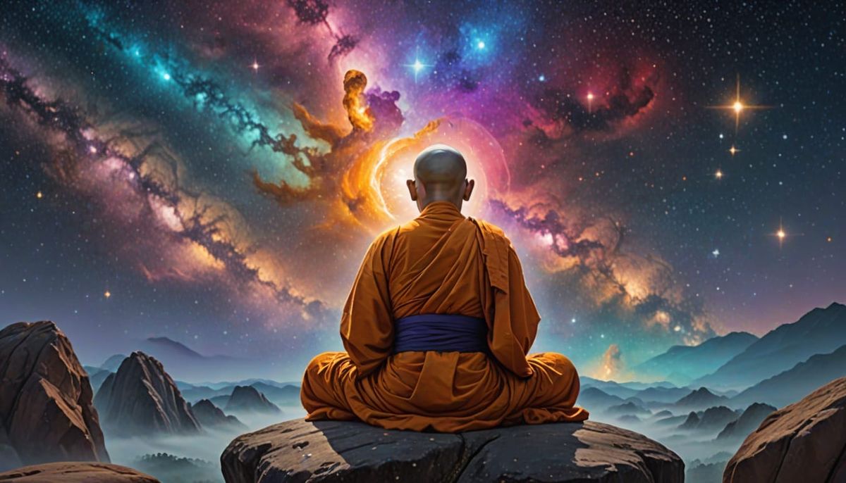 A vibrant oil painting depicting a Buddhist monk meditating on a rock, gazing at a galaxy. The surreal artwork features triadic colors, glowing stars, and a misty nebula, all illuminated by soft, golden light.