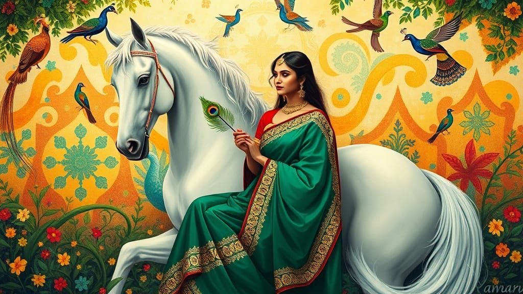This enchanting image features a serene woman in a stunning sari, surrounded by lush greenery, a majestic stallion, and vibrant Indian patterns, evoking the essence of Indian mysticism and cultural heritage, blending elements of traditional portraiture, naive art, and Art Nouveau.
