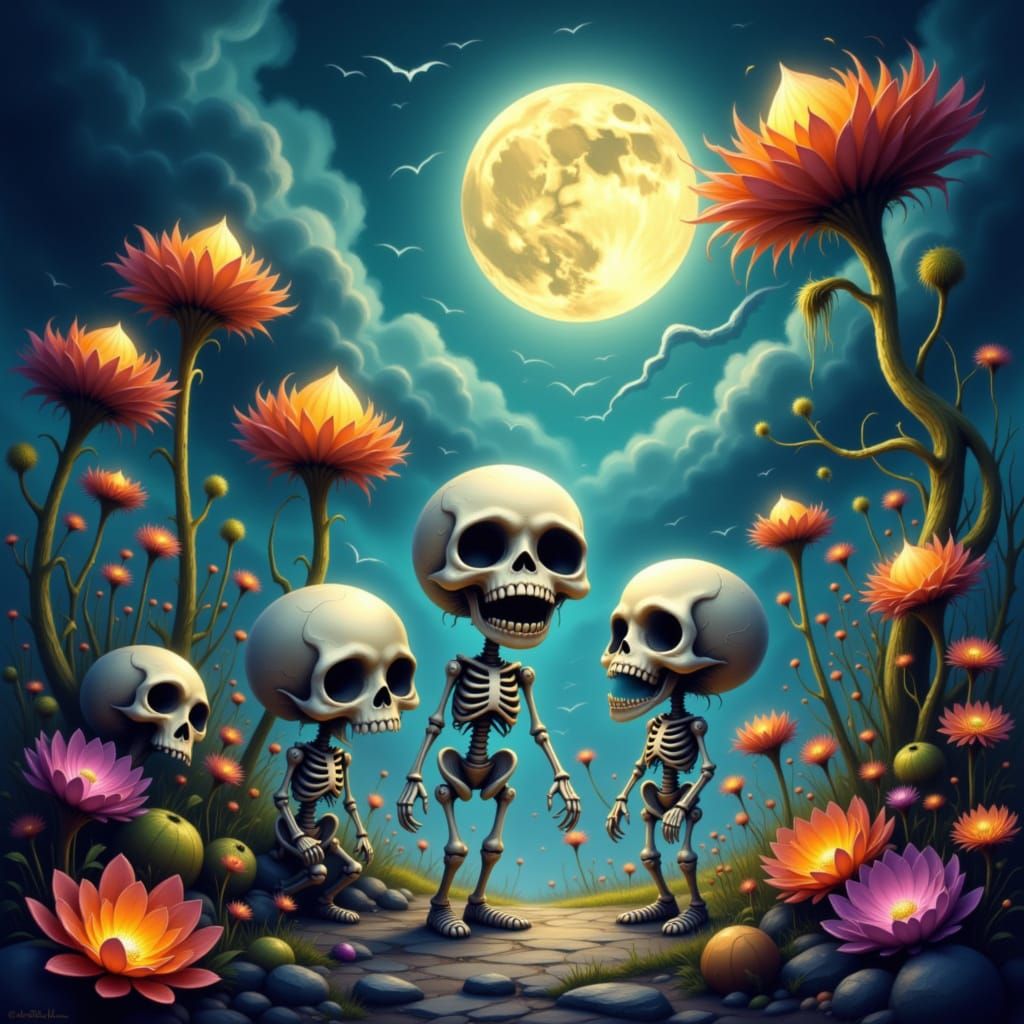 This image shows cute chibi skeletons joyfully playing among glowing flowers in a misty graveyard. Rendered in vibrant CGI with charming character design and soft lighting.