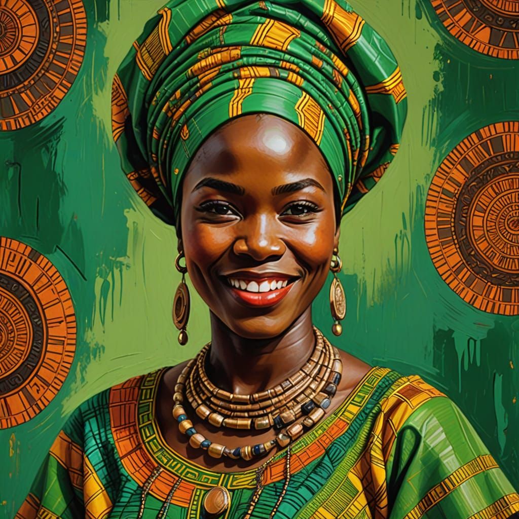 This image is a vibrant portrait of a Hausa woman in a bright green African outfit, set against a traditional backdrop. The warm, expressive brushstrokes evoke the style of Yinka Shonibare, with intricate patterns and rich textures adding depth to her traditional Nigerian attire.