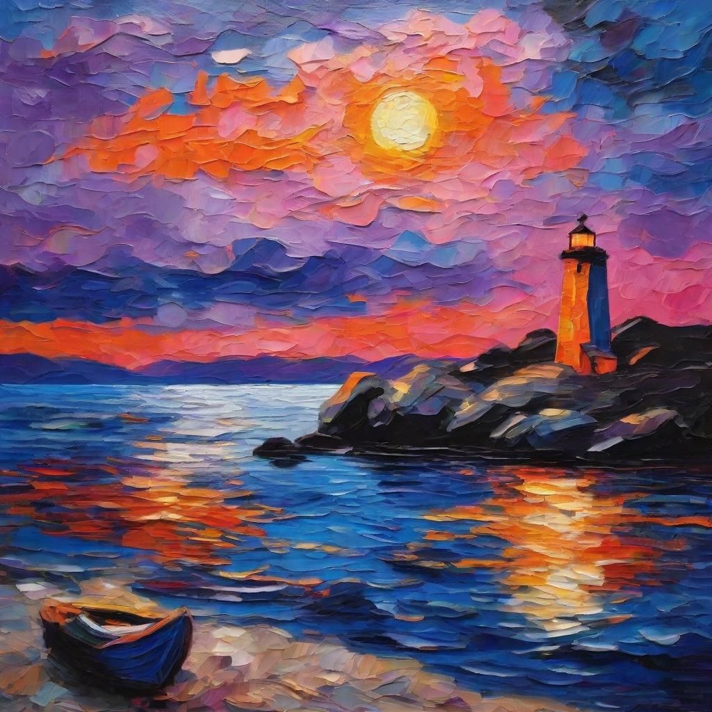 A vibrant painting of a blue lighthouse on a rocky shore at night, next to a small boat. The image evokes a nocturne with bold colors, expressive brushstrokes, and impasto techniques.