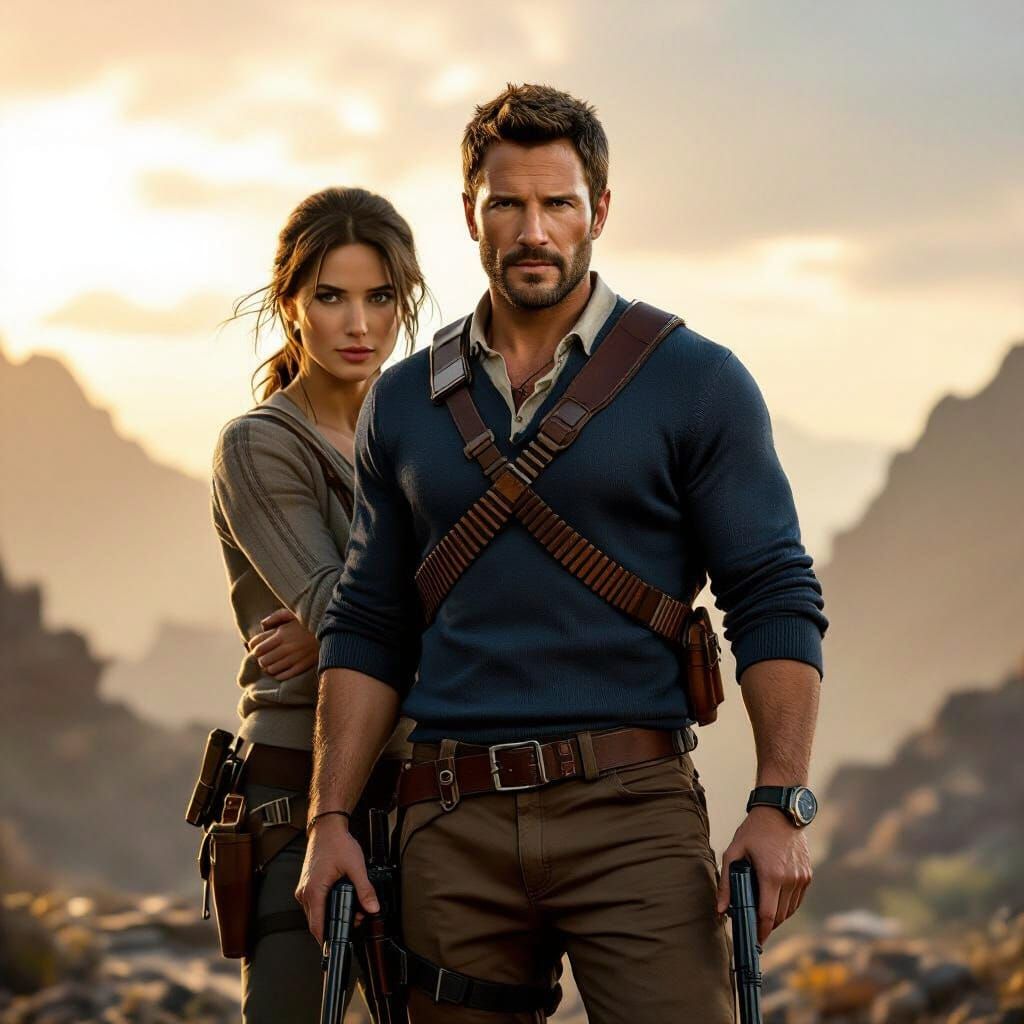 A realistic cinematic film still captures Nathan Drake holding his wife Elena, dressed in brown pants and a blue sweater. Shot on v-raptor XL with 35mm film grain and a vignette.