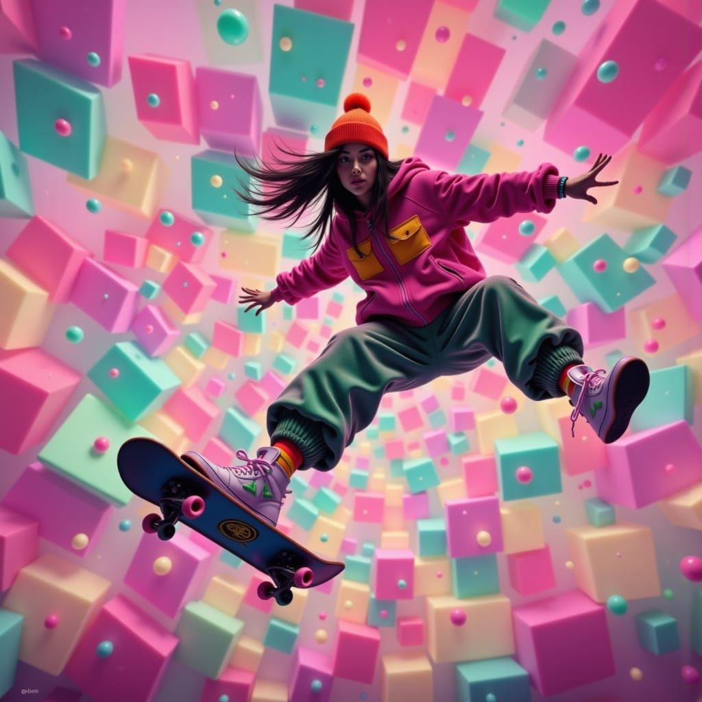 A dynamic image of a female skater airborne against a checkered backdrop. The artwork features neon colors and a retro aesthetic, reminiscent of a vintage Polaroid, with intricate details and a cinematic feel.
