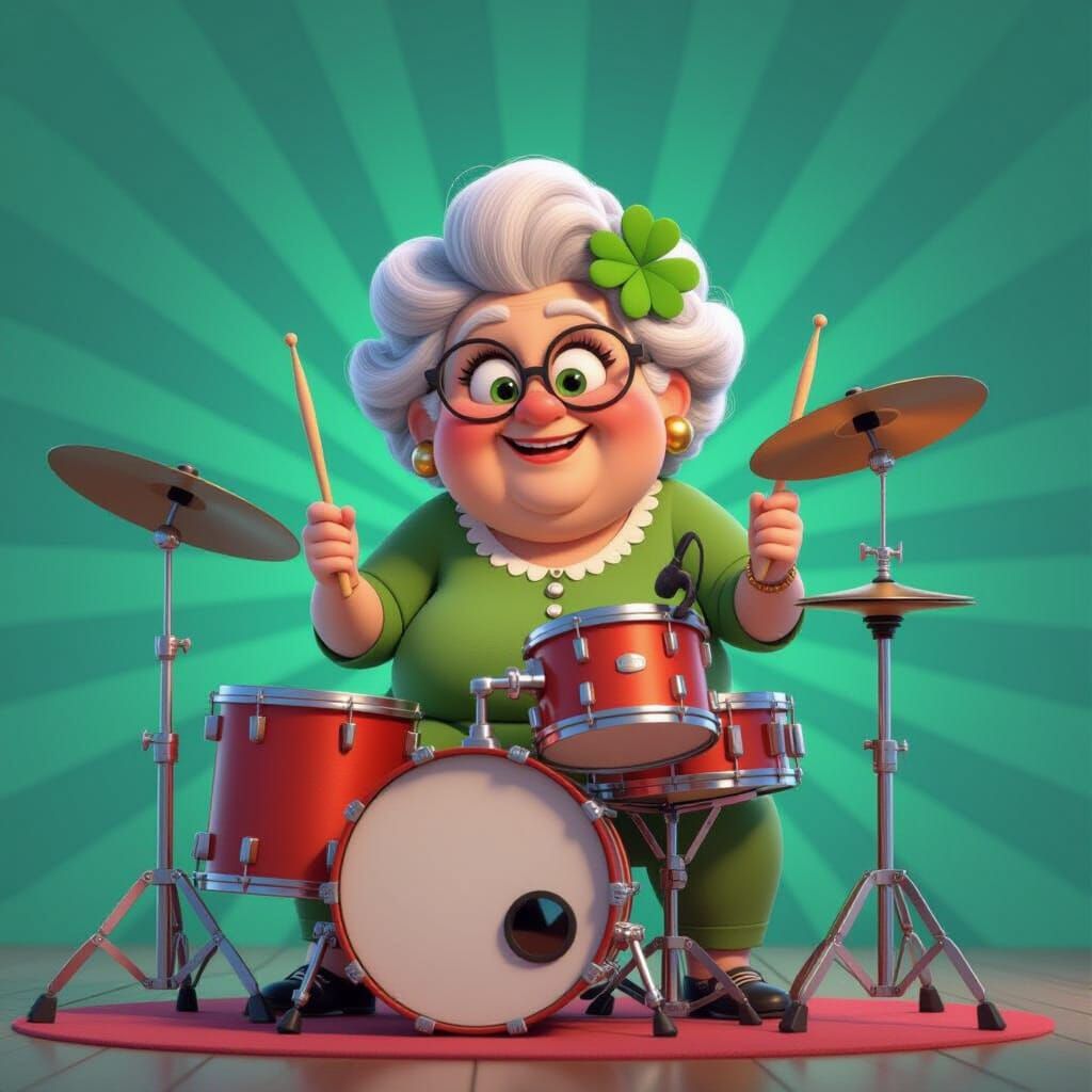 This image shows a cheerful, plump, grey-haired grandma joyfully playing the drums. Rendered in a bright, cinematic 3D digital art style reminiscent of Pixar animation.