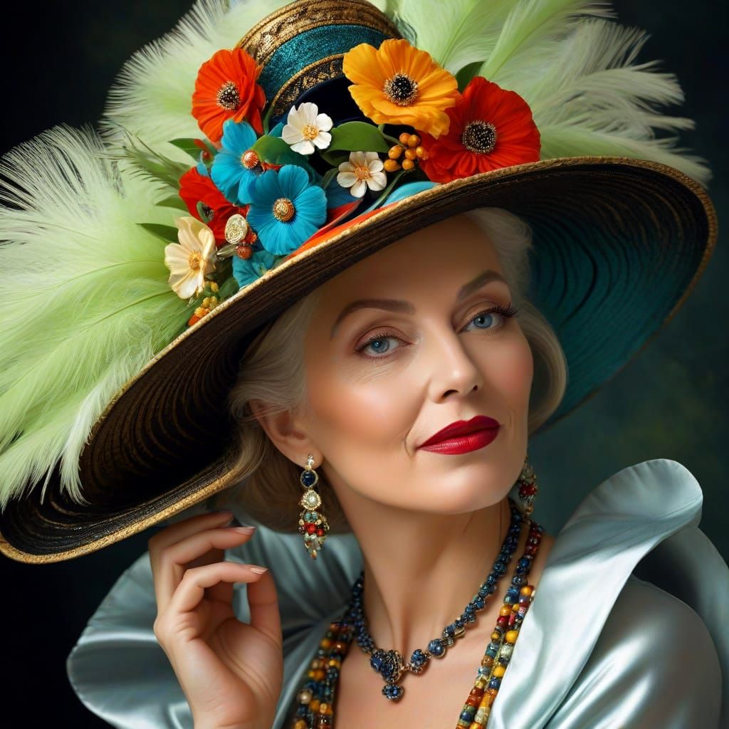 surreal incongruous fanciful whimsical scene with unexpected arrangement of incompatible elements in absurd bizarre composition; full-height image of lively magnetic captivating mature lady elegantly dressed in unusual multicolored retro-style outfit, natural graceful dynamic posture, ease of movement, ...