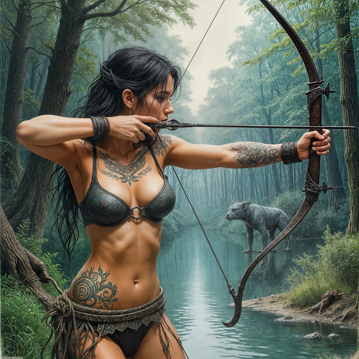 A beautiful, realistic side-view illustration of an Amazonian archer. The dark fantasy art style features a forest background, lake, strange creature, tattoos and a voluptuous figure.