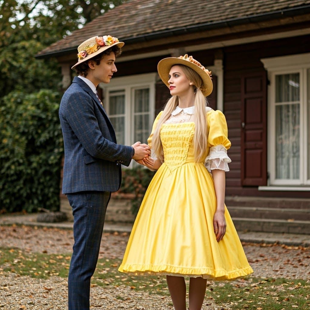 This image features a young androgynous individual with feminine features and blonde pigtails, dressed in a yellow Pollyanna dress and hat. The scene is set outside a charming house with a soft, natural background, captured with a shallow depth of field.