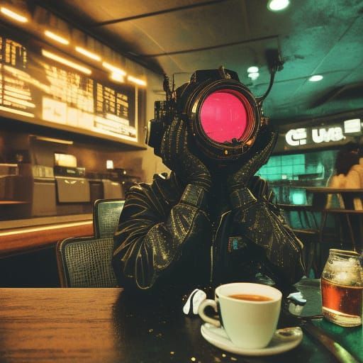 This image shows a cat girl in a cafe, rendered with retro sci-fi horror elements. The scene features a grainy, low-fidelity aesthetic reminiscent of 80s analog horror films.