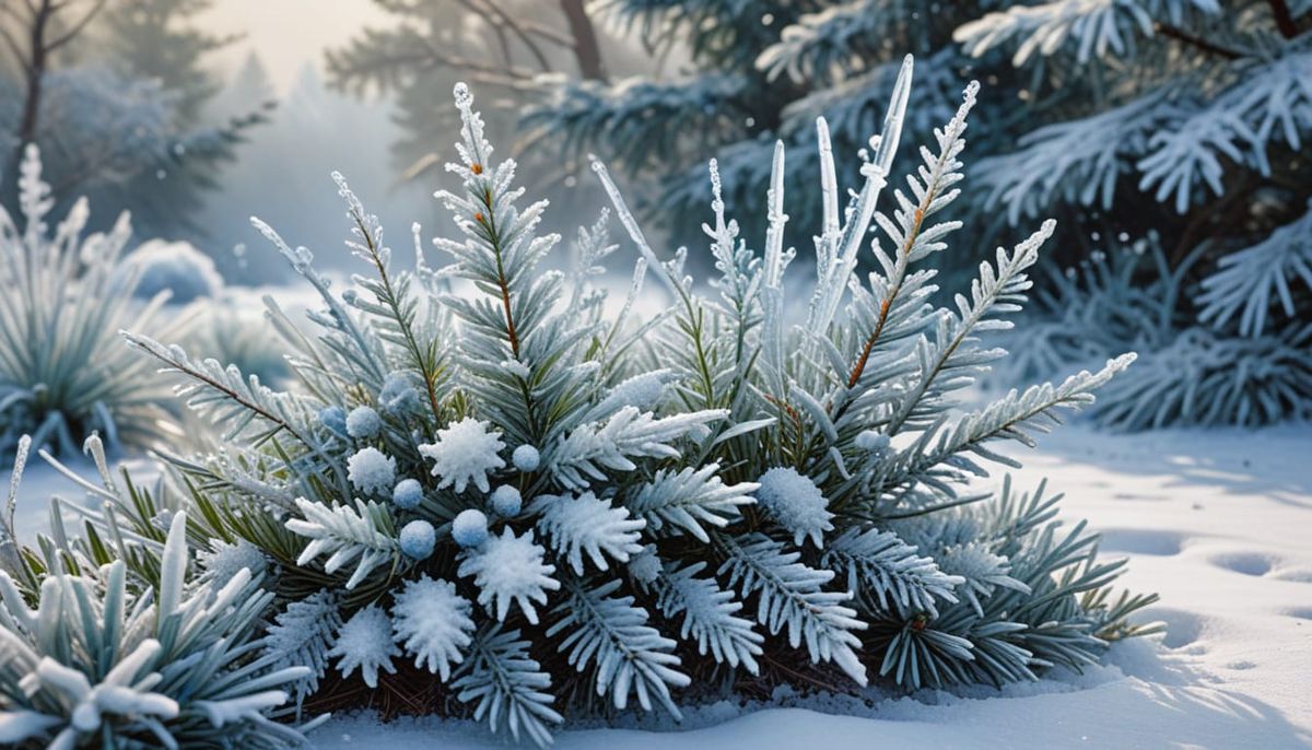 This image shows a snow garden festival with ice sculptures and winter blooms. The scene is depicted with soft, warm lighting and delicate frost, rendered in a watercolor and oil painting style with a pastel color palette.