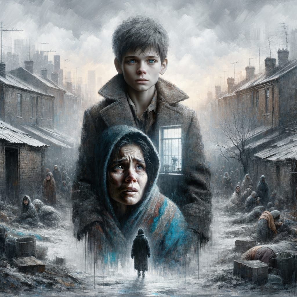 A poignant oil painting shows a young boy in an urban setting, with a double exposure of his mother looking out a window. The artwork uses layered brushstrokes and a muted color palette to convey feelings of desolation.