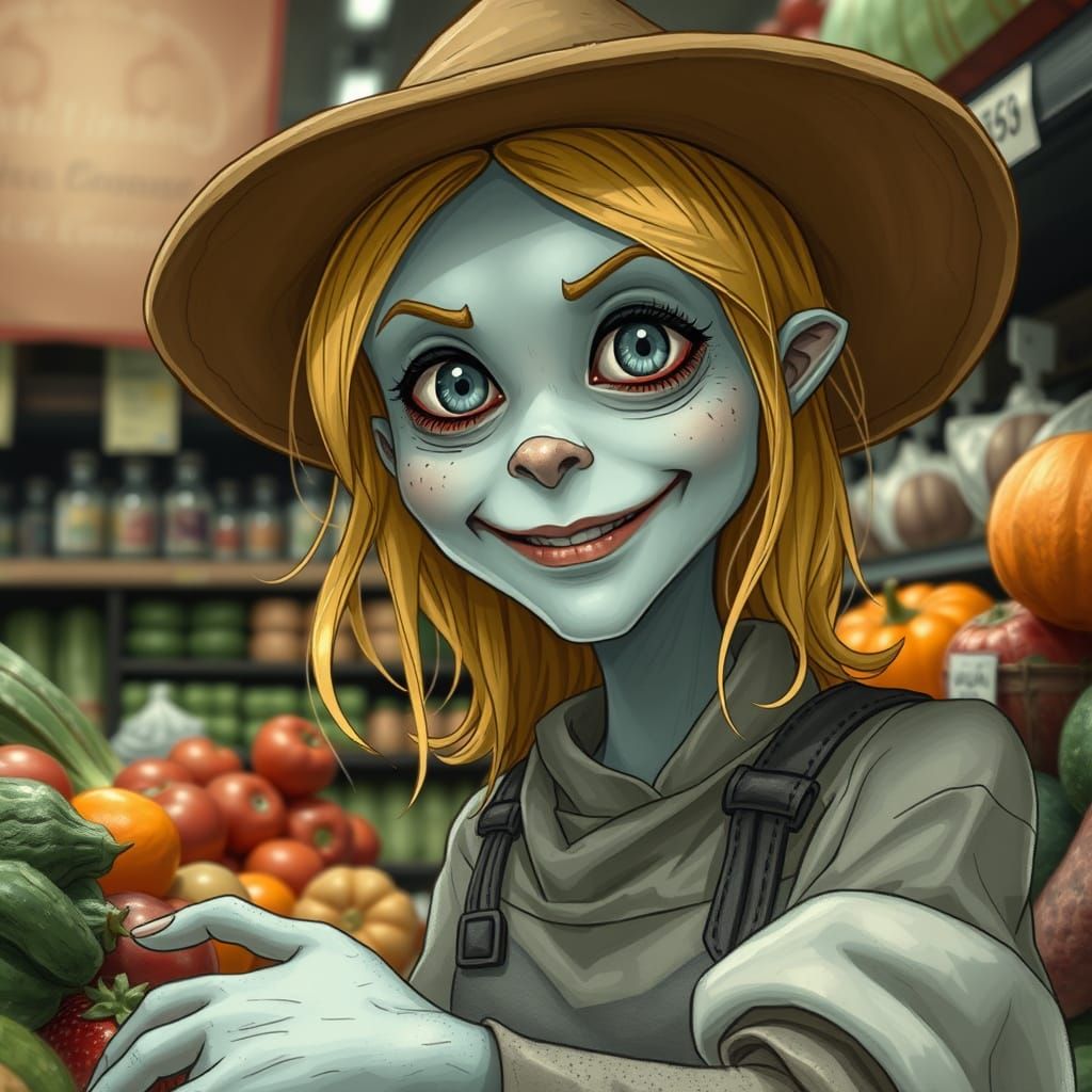 This image shows a slime monster woman with golden hair at a grocery store. She is smiling as she selects produce, rendered with intricate textures and muted colors in a whimsical style.