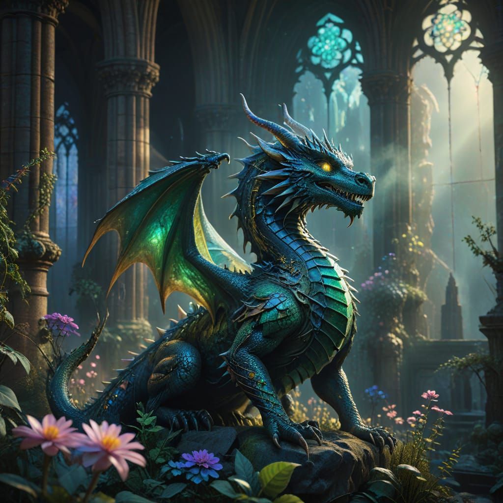 This image shows a majestic glass dragon perched atop a crumbling gothic cathedral, surrounded by swirling mist and glowing flowers. In a maximalist, cosmic aesthetic, the dragon's iridescent scales shimmer with an ethereal glow, while emerald green eyes pierce through the mist.