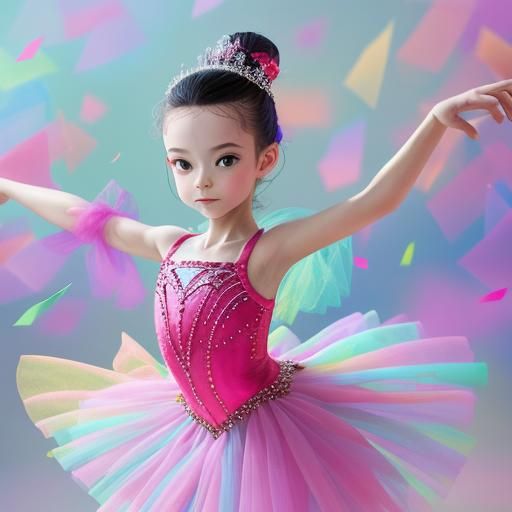 A stunning image of a child ballerina in a brightly colored tulle dress. The masterpiece is set against a blurred background, highlighting the dancer's form and movement.