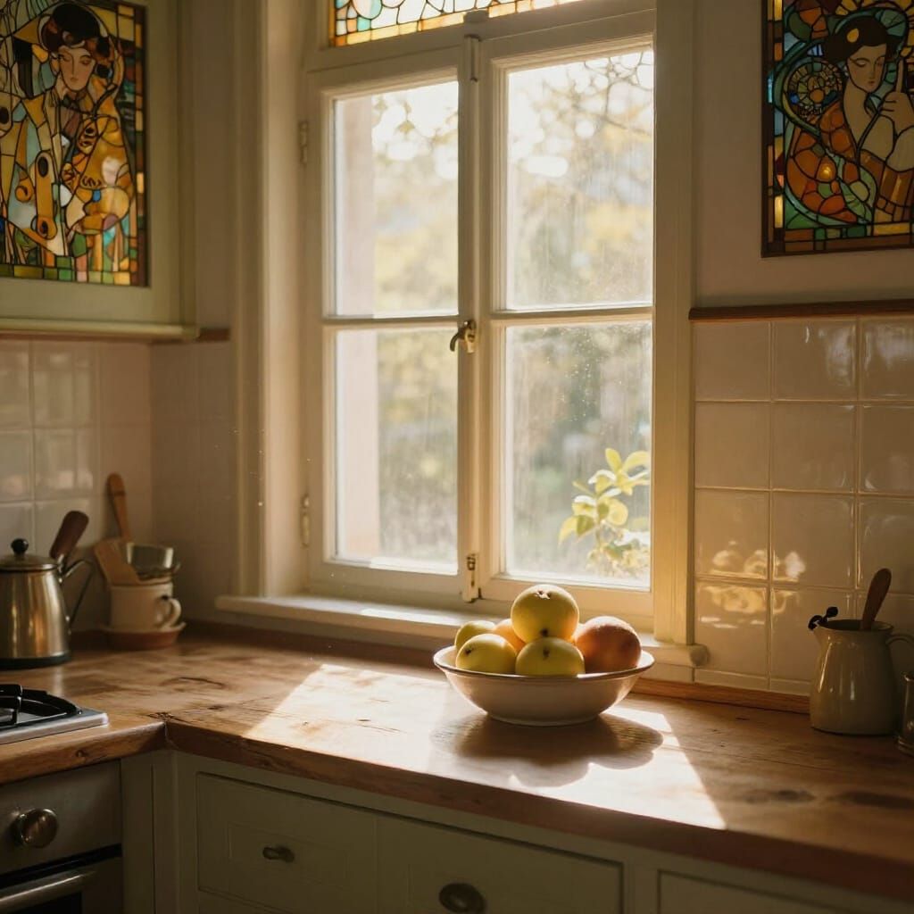 A serene kitchen interior bathed in warm, late afternoon sunlight. Features gleaming tiles, ripe fruit, and ornate details in a vintage French Art Nouveau aesthetic with flowing lines and stained glass accents.