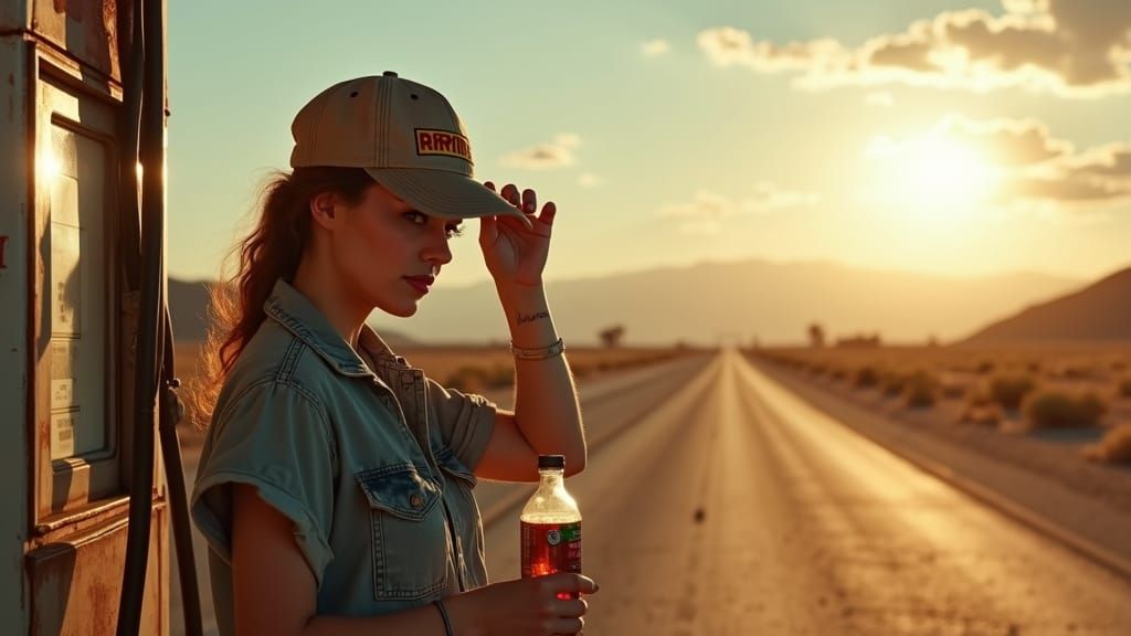 This image depicts a female gas station attendant in the Nevada desert, leaning on a vintage pump. Rendered with cinematic, surreal, and abstract digital matte painting techniques, it evokes a desolate beauty.