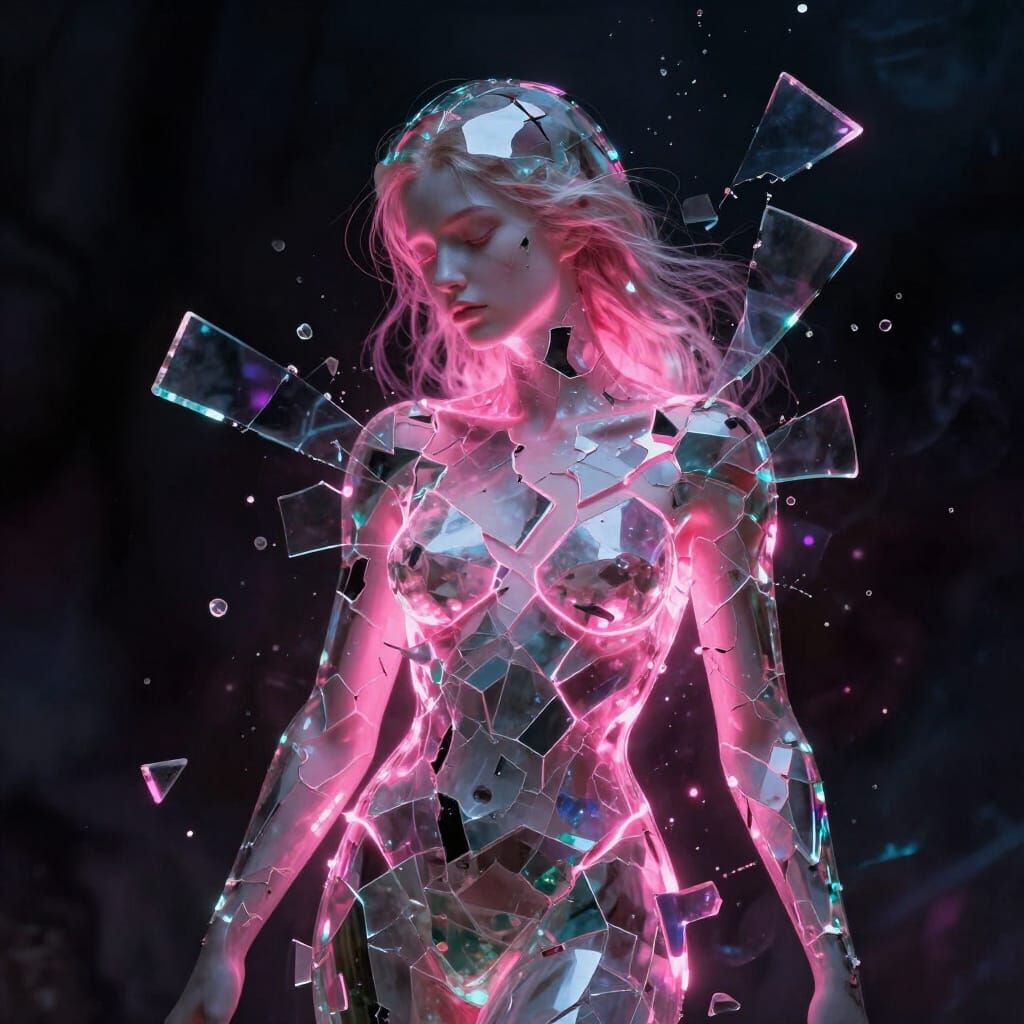 This image shows a surreal figure made of fractured, iridescent glass shards. A vibrant neon pink light pulses from the cracks against a dark, abstract background, creating a dramatic, ethereal glow.