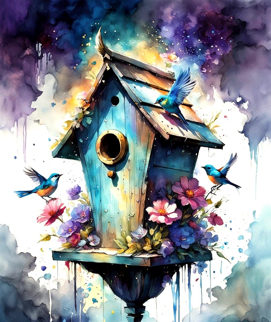 A watercolor painting of a birdhouse with a colorful bird perched nearby. The artwork features a vibrant palette and intricate details, enhanced by sunlight and a faded aesthetic in the style of fine art.