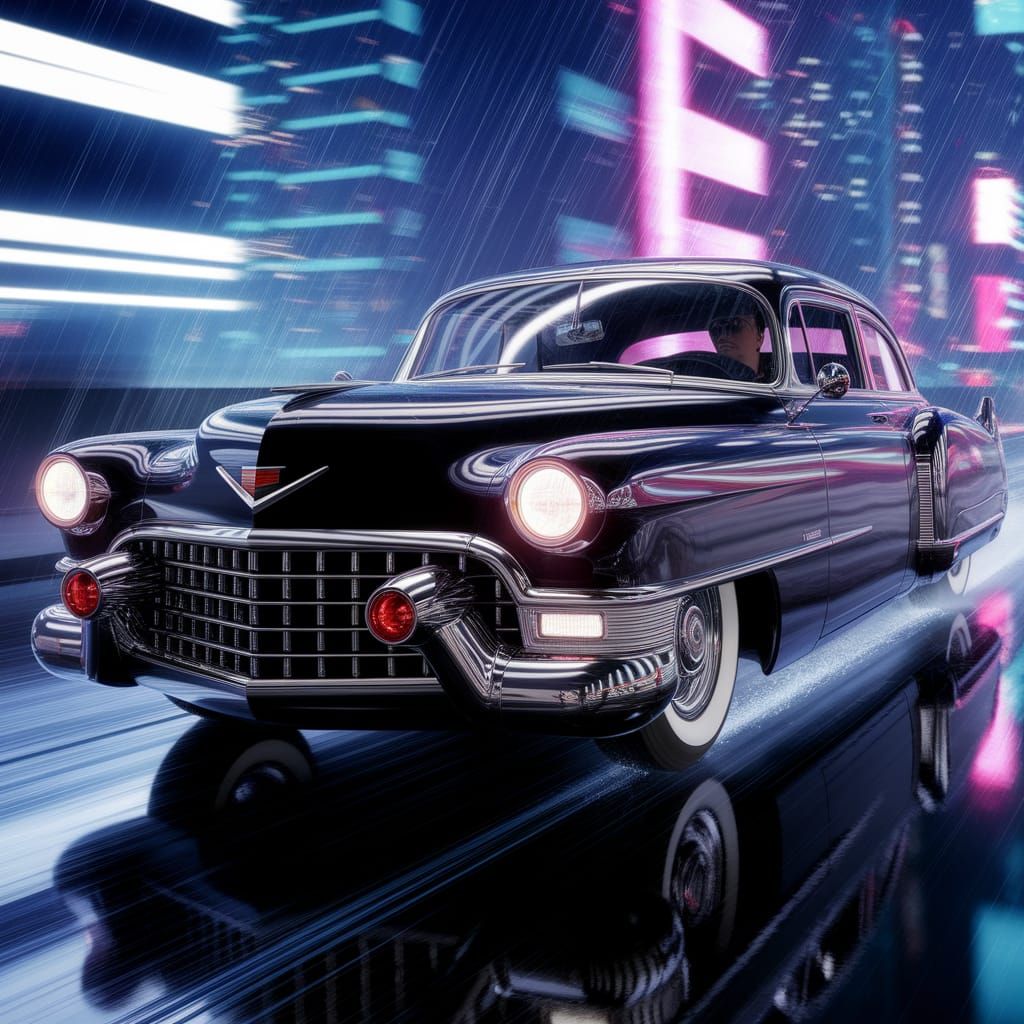 A dynamic image of a sleek, chrome-plated vintage car speeding through a neon-lit city at night, capturing the energy of the urban environment with vibrant reflections and metallic textures.
