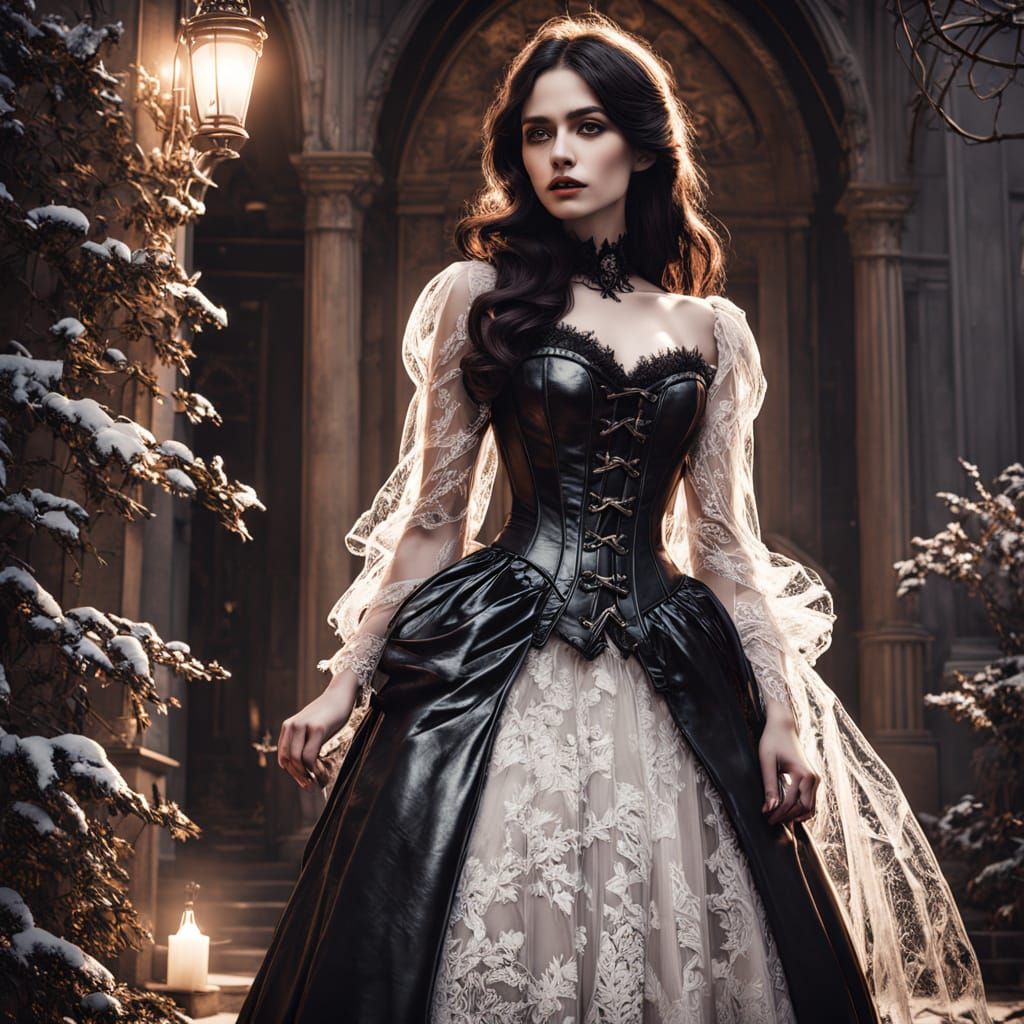 This image captures an ethereal woman with snow-white skin and dark hair, adorned in a leather corset and lace skirt, set against a detailed Victorian house during moody twilight.
