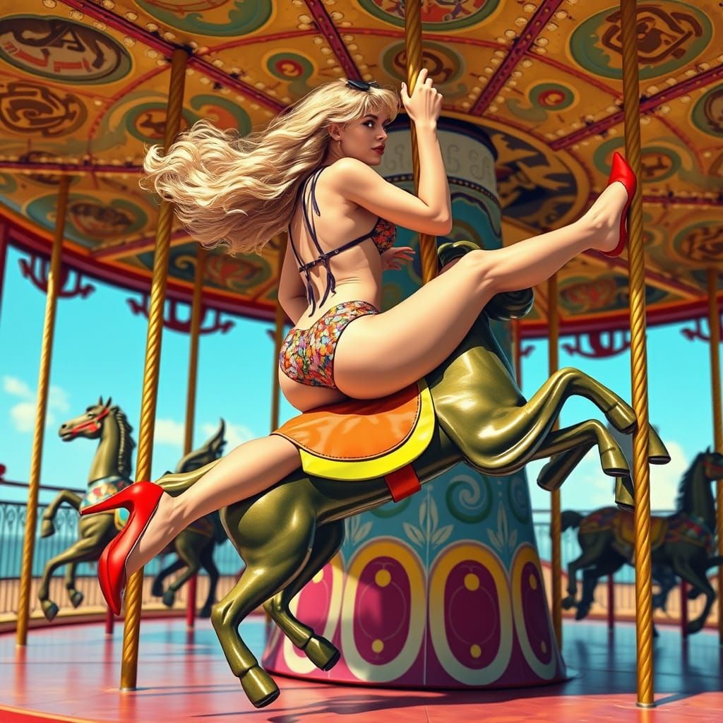 A vibrant image of a blonde woman riding a carousel backwards. She's wearing a bikini and high heels, with her legs extended dynamically, in a style that blends realism and whimsy.