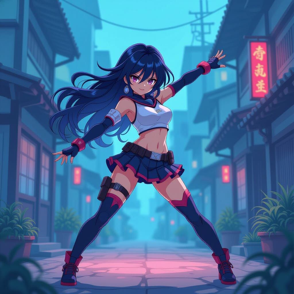This image shows a vibrant anime character striking a dynamic pose within a detailed manga environment. The artwork features cel-shading, rich colors, and intricate linework, reminiscent of classic anime wallpapers.