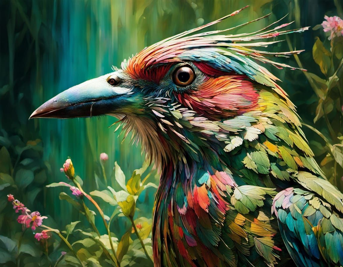 This image depicts a bird singing in a vibrant, blooming cottage garden, rendered in intricate detail with a focus on color depth and dramatic lighting.