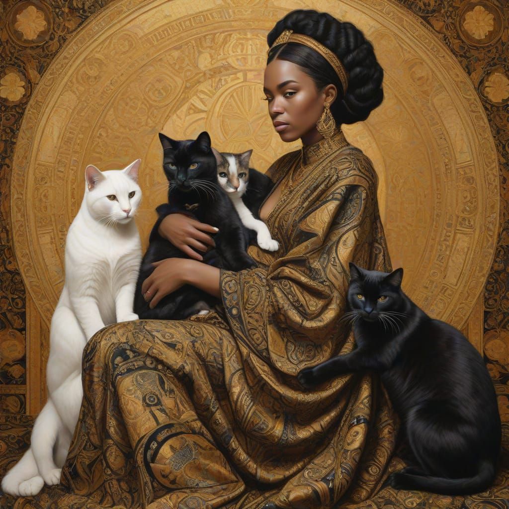 This image shows an elegant woman surrounded by opulent velvet and intricate Byzantine patterns, with two majestic cats by her side. The artwork features dense textures and ornate details reminiscent of Gustav Klimt and Wadim Kashin's styles.
