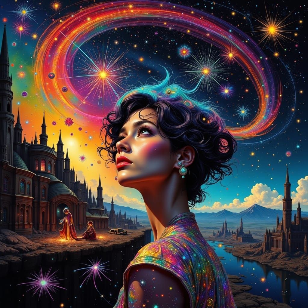 This image shows vibrant, iridescent stars streaking across a deep, inky blue galaxy, evoking a dreamy, ethereal quality with a mix of futuristic and abstract art elements