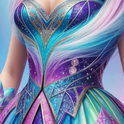 This image showcases a fashion designer's concept art. The vibrant digital illustration features glittering fabrics, dramatic lighting, and a pastel color scheme, emphasizing stylish patterns and creative elegance.