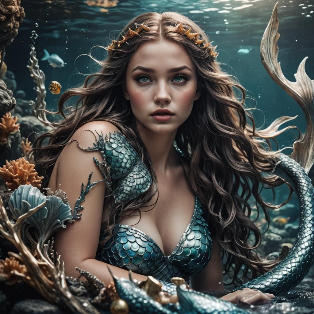 This image shows a modern mermaid in a hyperrealistic style. The composition is cinematic, with intricate details, sharp focus, and high contrast to create an atmospheric and moody scene.
