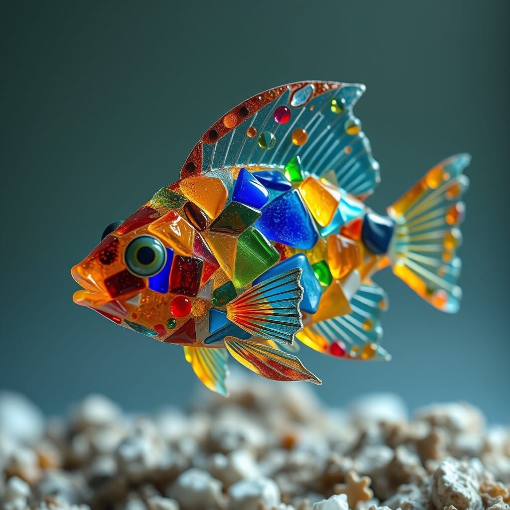 This hyperrealistic HDR photograph showcases a fish intricately crafted from multicolored sea glass, with exceptional detail.