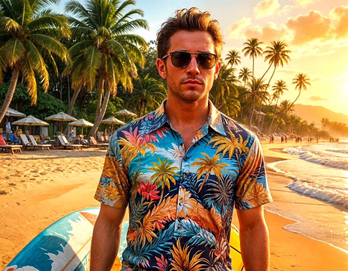 A vibrant beach scene of a man with a surfboard at sunset. The image captures the carefree spirit of the 1950s in a hyperrealistic and detailed digital watercolor.