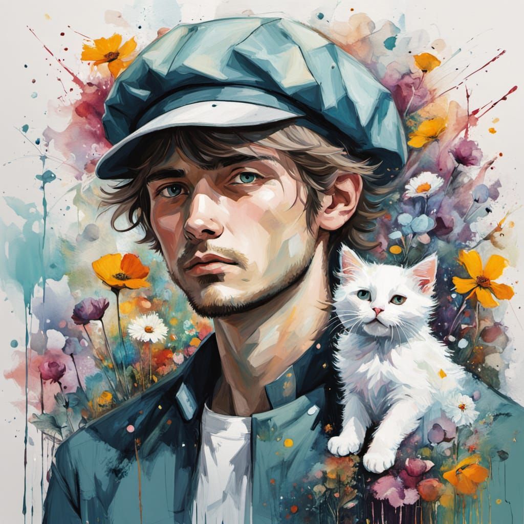 This image depicts a boy wearing a baker boy cap with a white kitten nearby, set in a sunny wildflower meadow. It features expressive brushwork with drips and splashes, dominated by cool muted pastels.