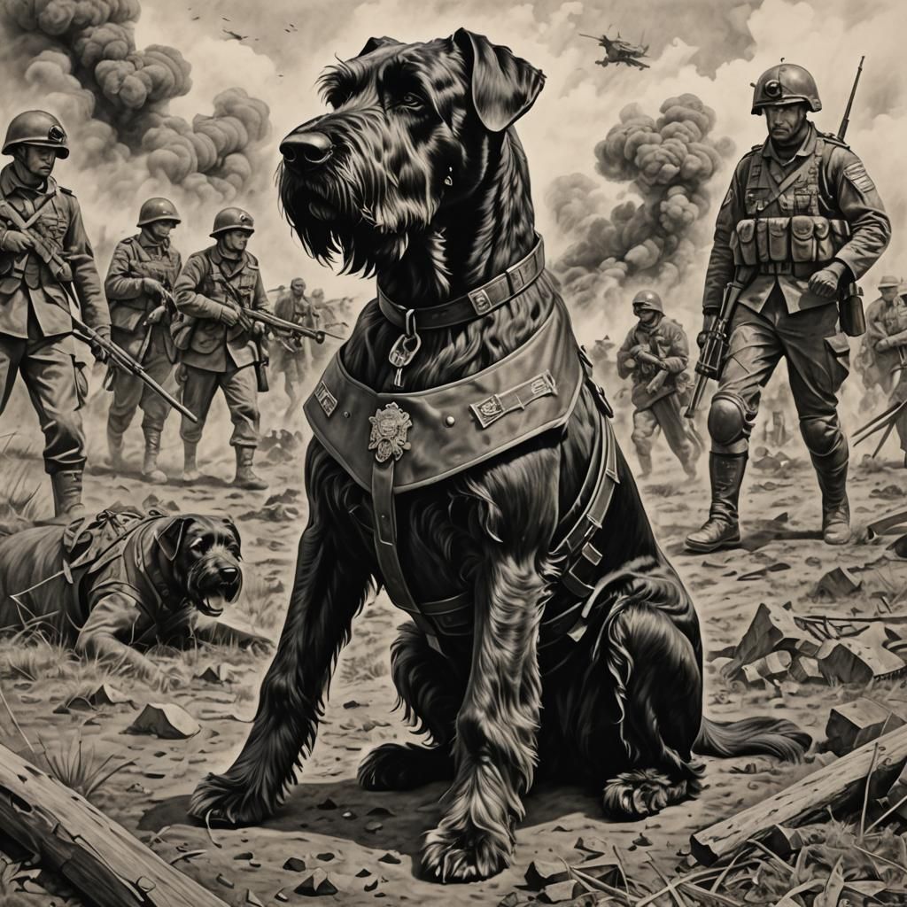 This image shows a giant schnauzer in a full military outfit on a battlefield. The charcoal drawing is hyperdetailed, highlighting the dog's features and the scene's intensity.