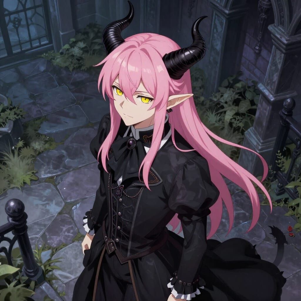 This image shows a male character with long pink hair, pointy ears, yellow eyes, black horns, and a demon tail, dressed in a black Victorian goth style. He is depicted in an overhead view outside a gothic manor.