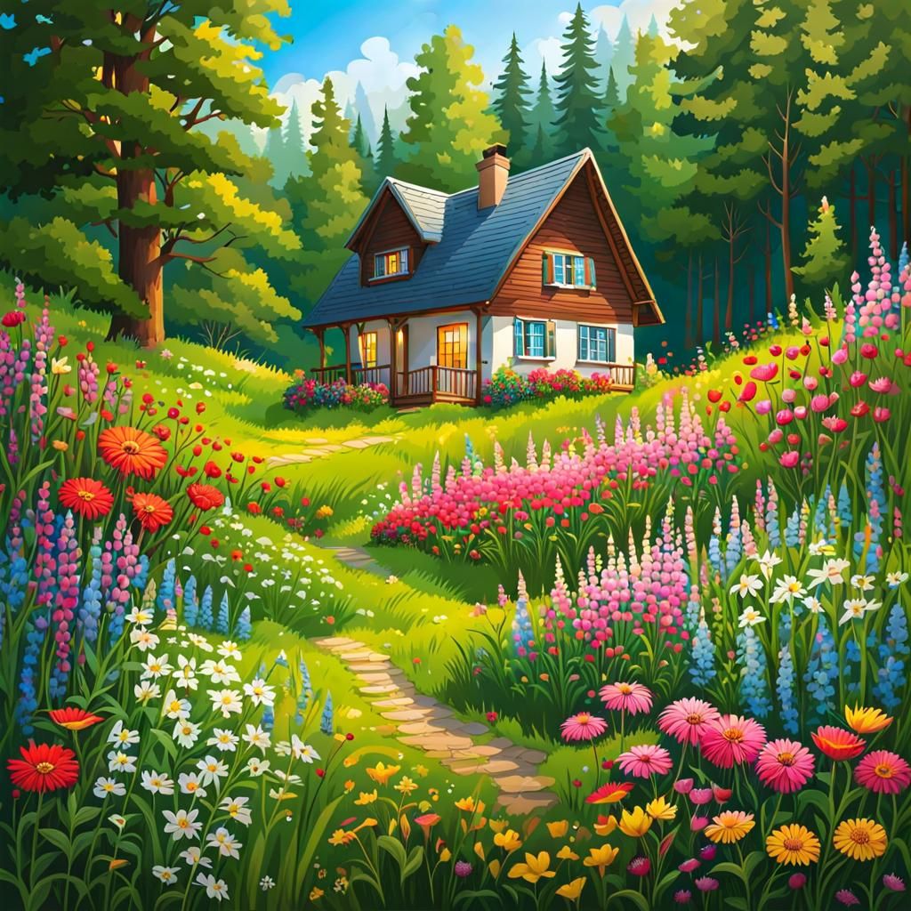 This image shows a family enjoying their vacation near a cottage nestled in a forest. A vibrant flower meadow adds to the idyllic scene, creating a serene and joyful atmosphere.
