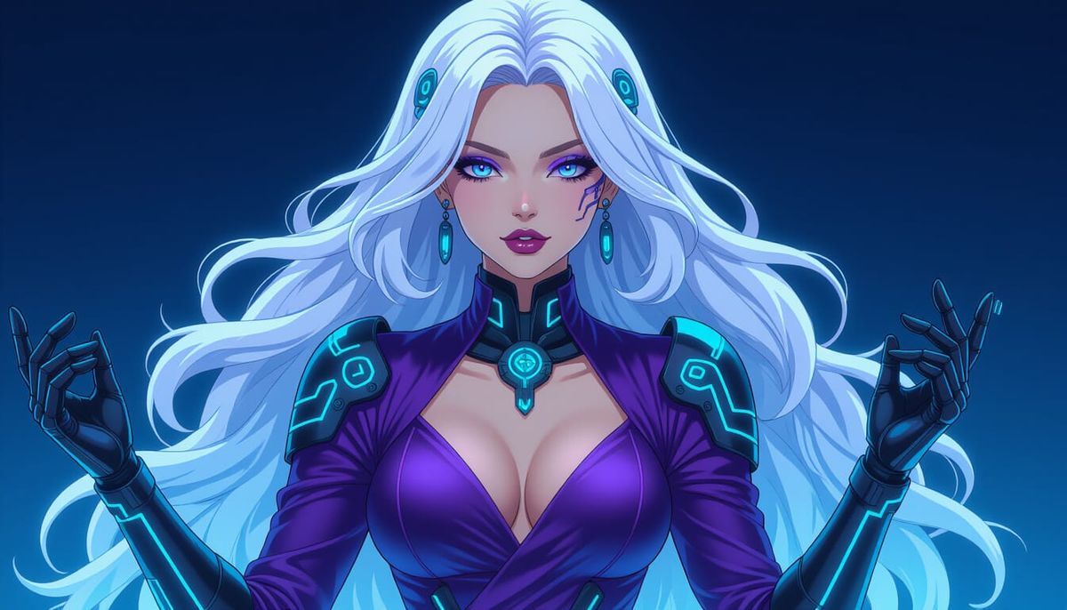 This image showcases an AI-generated android with white skin and vibrant turquoise neon circuits. It features white hair, purple eyes, and a flowing purple silk dress with cyan accents and cyber-tech boots.