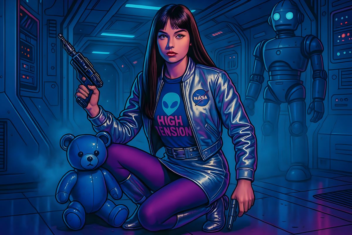 This image shows a spacegirl in a spaceship interior with retro 80s styling. The scene features vibrant colors, geometric graffiti art elements, and a cinematic, high-contrast aesthetic.