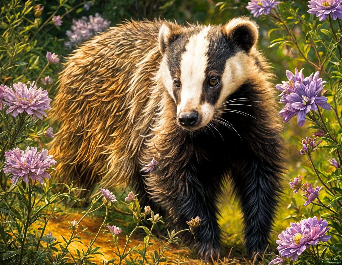 This hyper-realistic image features a detailed portrait of a maiden walking on a path with two badgers. The artwork is rendered in a richly textured impasto style with ornate, surreal elements.