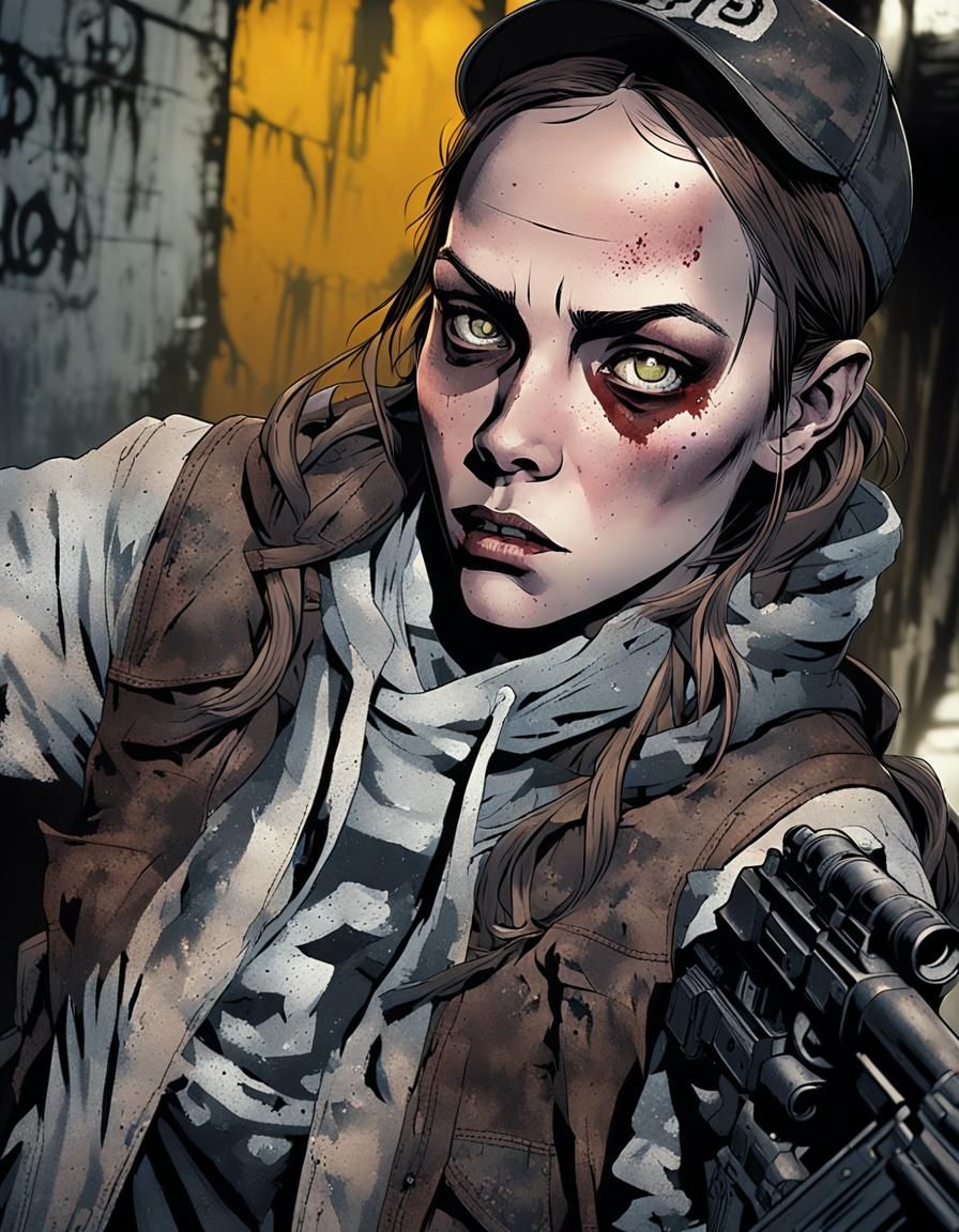 This image shows a gritty comic art style portrait of a woman in a cap holding a gun in a dark alley. The artwork has a creepy, cinematic atmosphere with dramatic lighting.