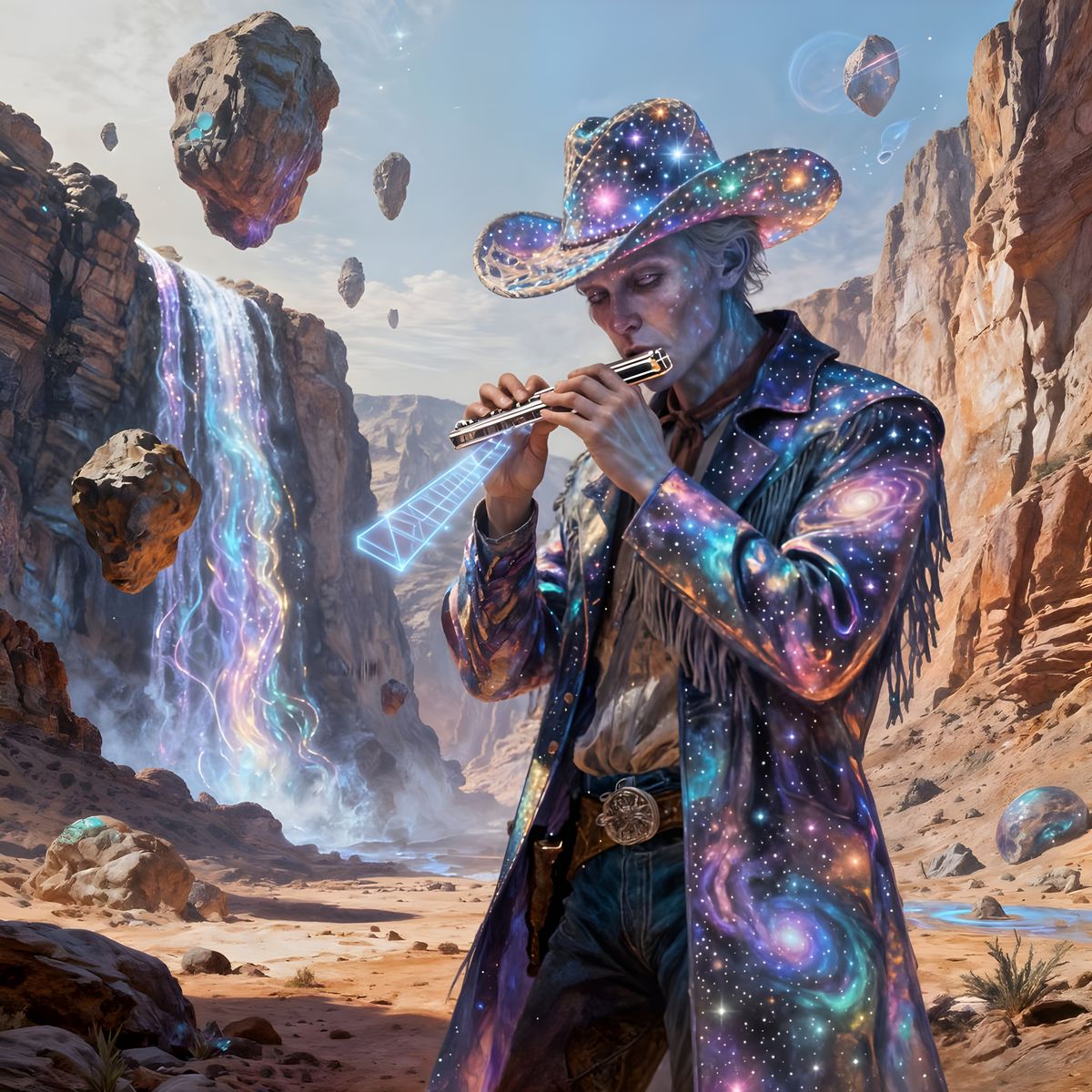This image shows an otherworldly cowboy with a starlight Stetson and galactic coat playing a holographic harmonica amidst floating rocks and energy waterfalls in a surreal alien landscape. It captures a whimsical, fantastical scene with vibrant, iridescent colors.