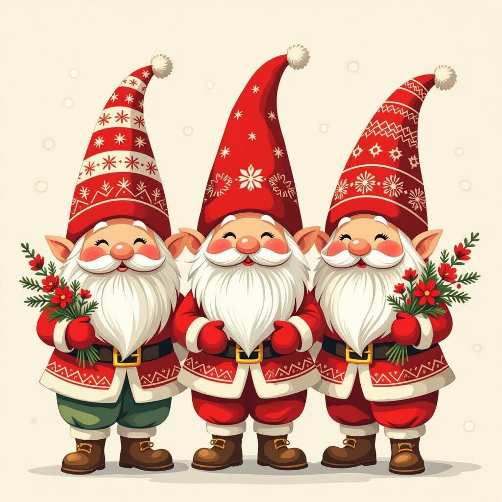 This image shows three charming Nordic gnomes in red and white with patterned hats, holding holiday decorations or flowers. Rendered in a whimsical digital illustration style, reminiscent of classic storybook art.