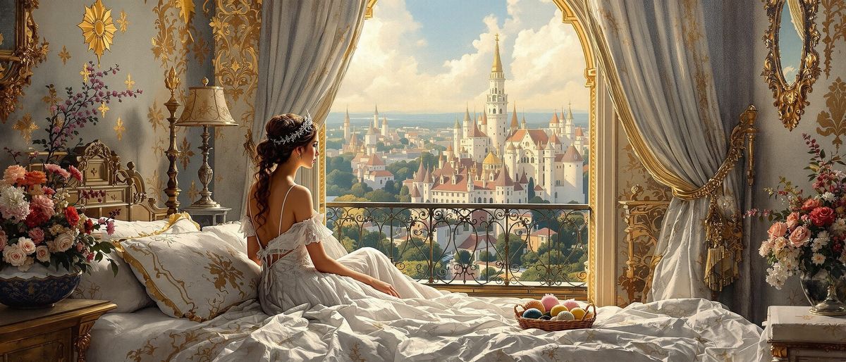 This image shows a princess in a white and gold bohemian bedroom, gazing out at a fantasy kingdom. The artwork is reminiscent of an oil on cracked canvas painting with impasto details.