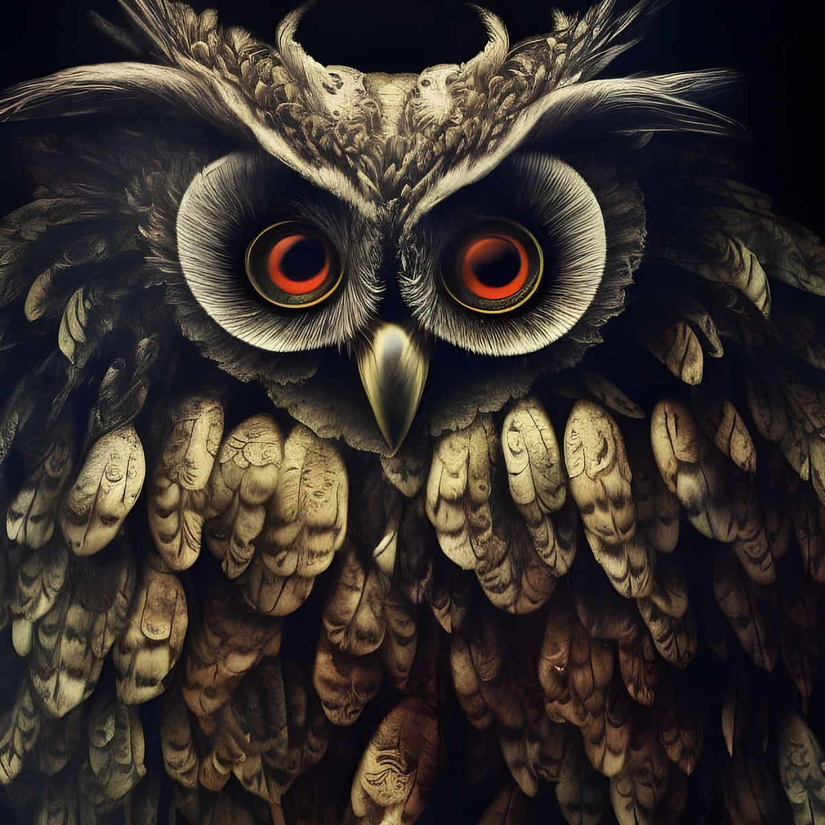 A photorealistic image of an ancient owl god in a natural setting. The picture employs holographic and ethereal elements, with a moody, cinematic feel and amazing depth of field.