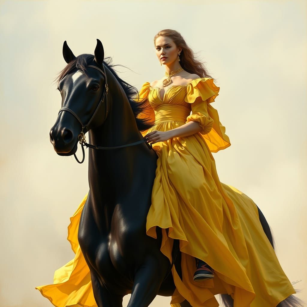 A striking picture of a woman riding a black horse while wearing a long yellow dress. The image evokes elegant lines and golden light, reminiscent of art nouveau and classical portraiture.