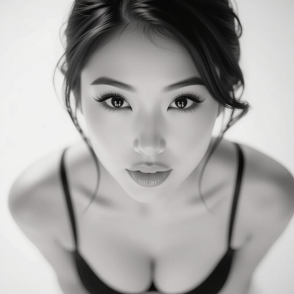 A close-up, photorealistic portrait of a beautiful Asian woman with a playful, flirty expression. Captured in cinematic style with sharp focus on her eyes and lips, showcasing detailed skin texture and intimate lighting.
