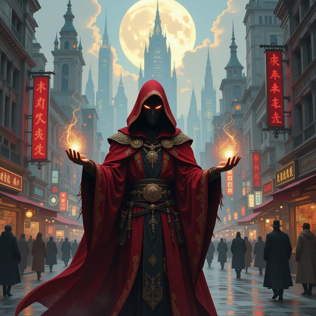 A striking picture of a sorcerer performing a ritual in a fantastical city. The image blends art nouveau and dark fantasy with crimson, gold, and emerald colors, reminiscent of digital painting.