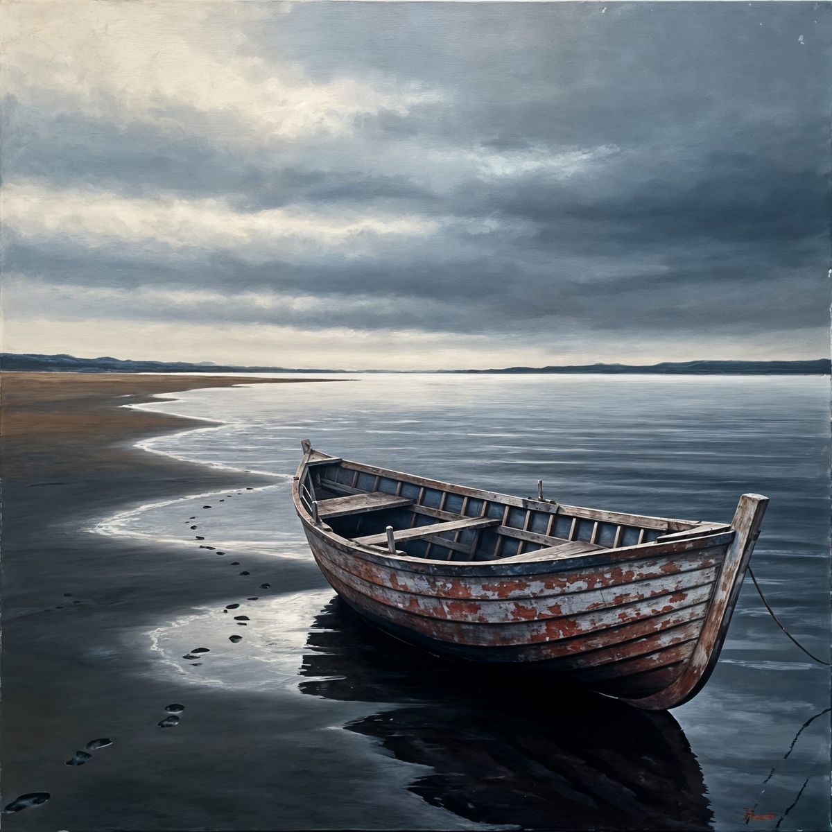 This image shows a poetic landscape painting of a lone, weathered rowboat on a dark beach. The somber palette and thick painterly application evoke a sense of contemplative emptiness.